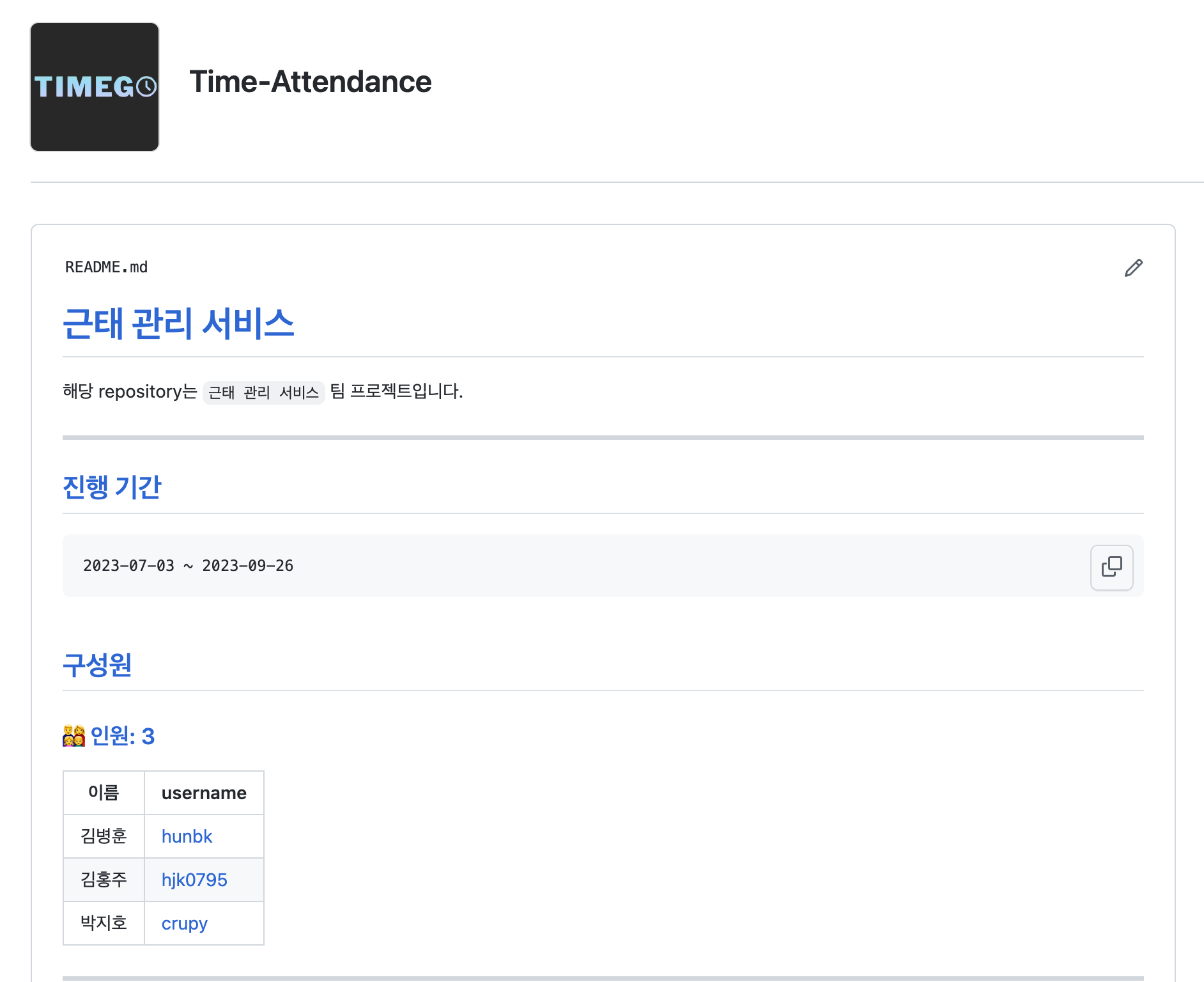Time-Attendance Time-Attendance has 3 repositories available. Follow their code on GitHub. github.com 공유하기 게시글 관리 비버의 개발 일지 저작자표시 비영리 (새창열림) '프로젝트 > 근태관리 프로젝트' 카테고리의 다른 글 프로젝트 완성 및 느낀 점 (0) 2023.09.27