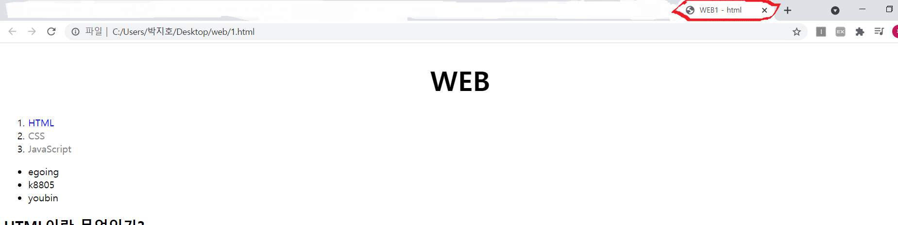 그림에서 빨간 동그라미 부분을 나타내는 것이 <title> 태그이다.