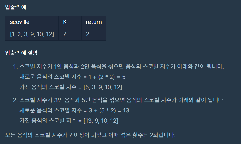 public int solution(int[] scoville, int K) { //더 맵게